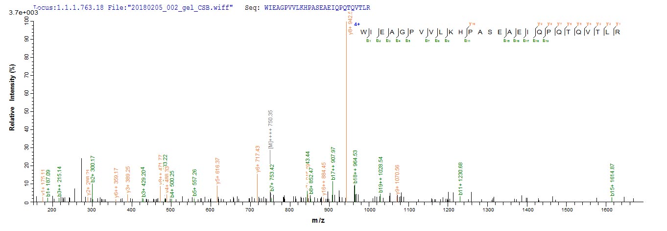 Based on the SEQUEST from database of Yeast host and target protein, the LC-MS/MS Analysis result of CSB-YP622651HU could indicate that this peptide derived from Yeast-expressed Homo sapiens (Human) PTK7.