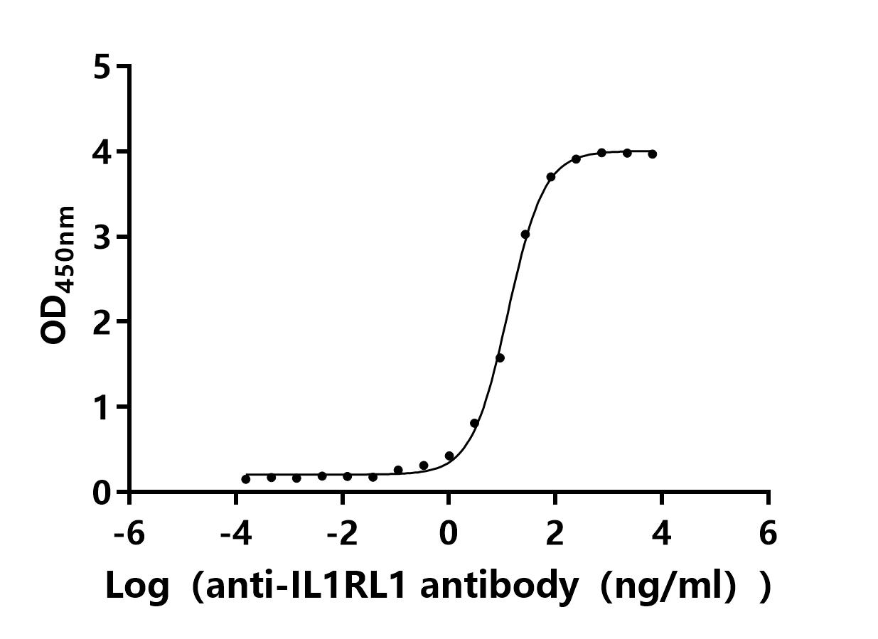 ①Measured by its binding ability in a functional ELISA.Immobilized Human IL1RL1 at 2 μg/ml can bind Anti-IL1RL1 recombinant antibody(CSB-RA011626MA1HU). The EC50 is 6.366-7.698 ng/mL. Biological Activity Assay -