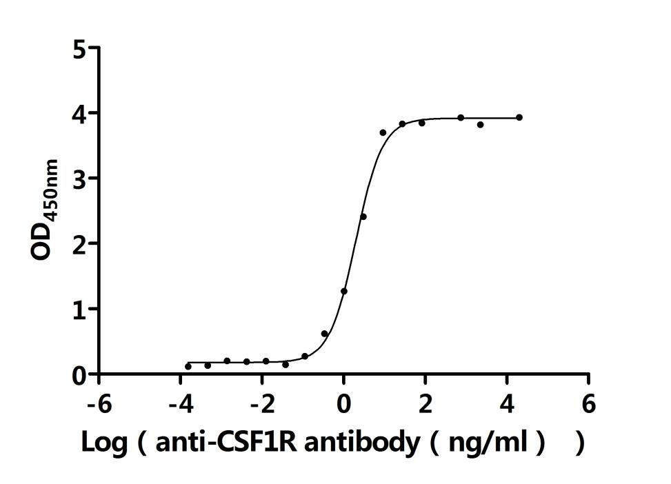①Measured by its binding ability in a functional ELISA. Immobilized Human CSF1R at 2 μg/ml can bind Anti-CSF1R recombinant antibody (CSB-RA006044MA1HU). The EC50 is 1.800-2.218 ng/mL. Biological Activity Assay -