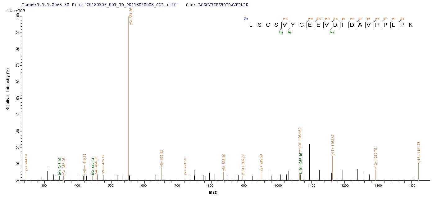 Based on the SEQUEST from database of Yeast host and target protein, the LC-MS/MS Analysis result of CSB-YP016314HU could indicate that this peptide derived from Yeast-expressed Homo sapiens (Human) OGN.