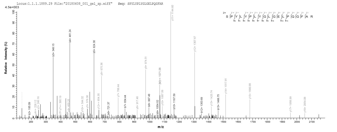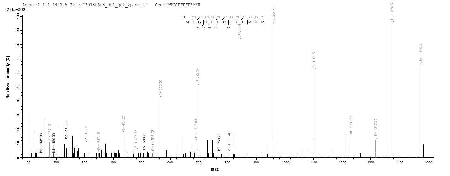 Based on the SEQUEST from database of E.coli host and target protein, the LC-MS/MS Analysis result of CSB-RP009454h could indicate that this peptide derived from E.coli-expressed Homo sapiens (Human) GDI2.