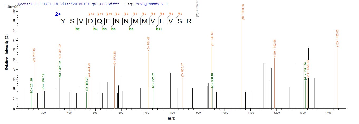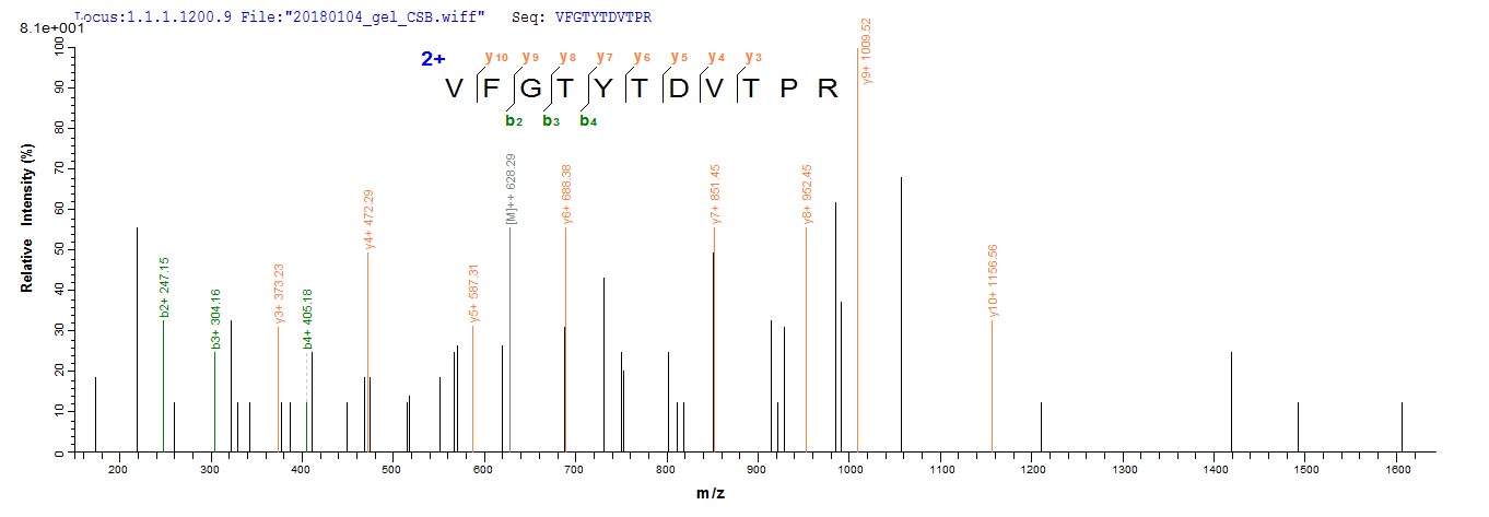 Based on the SEQUEST from database of E.coli host and target protein, the LC-MS/MS Analysis result of CSB-RP033754h could indicate that this peptide derived from E.coli-expressed Homo sapiens (Human) STARD7.