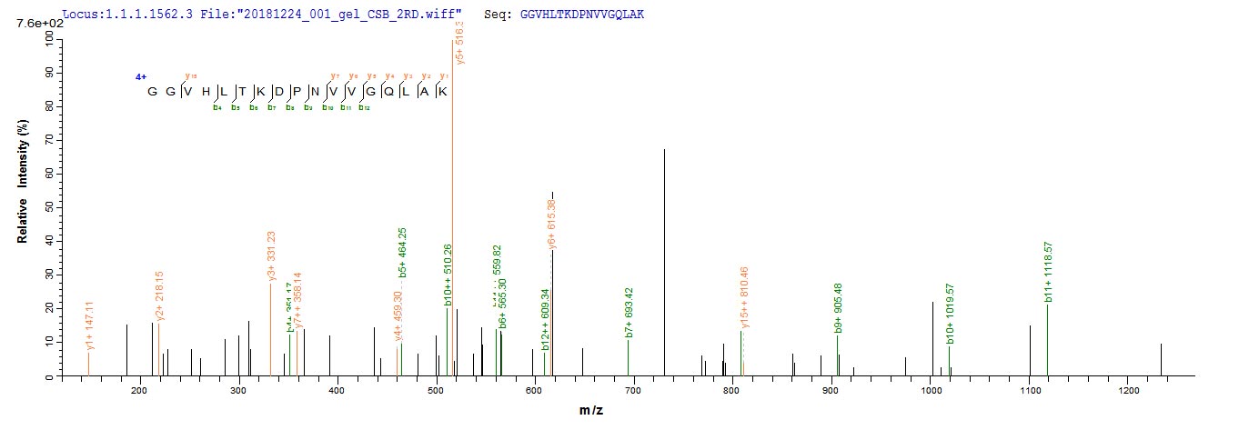 Based on the SEQUEST from database of E.coli host and target protein, the LC-MS/MS Analysis result of CSB-EP846636HU could indicate that this peptide derived from E.coli-expressed Homo sapiens (Human) SUCLG2.
