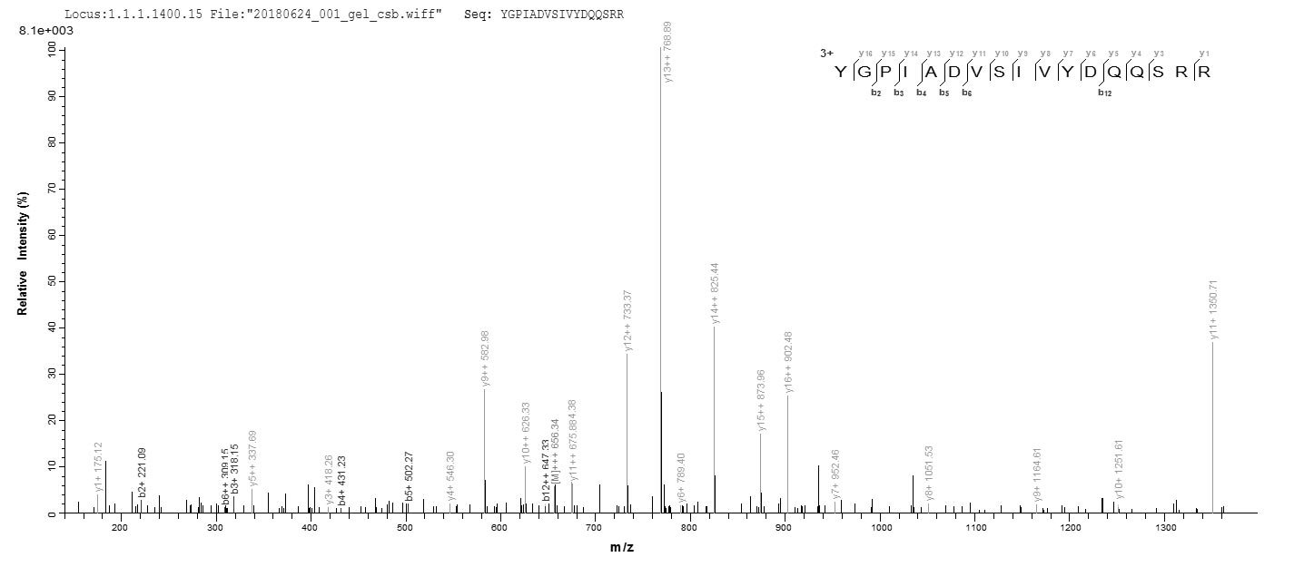 Based on the SEQUEST from database of E.coli host and target protein, the LC-MS/MS Analysis result of CSB-EP021143HU1 could indicate that this peptide derived from E.coli-expressed Homo sapiens (Human) TRA2B.