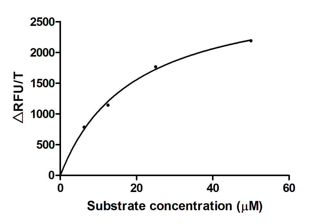 Recombinant Human TMPRSS2 His tag protein (CSB-MP023924HU(M)b0) enzyme activity is measured by its ability to cleave fluorogenic peptide substrate(Boc-Gln-Ala-Arg-AMC), The Km is 19.16μM. Biological Activity Assay -