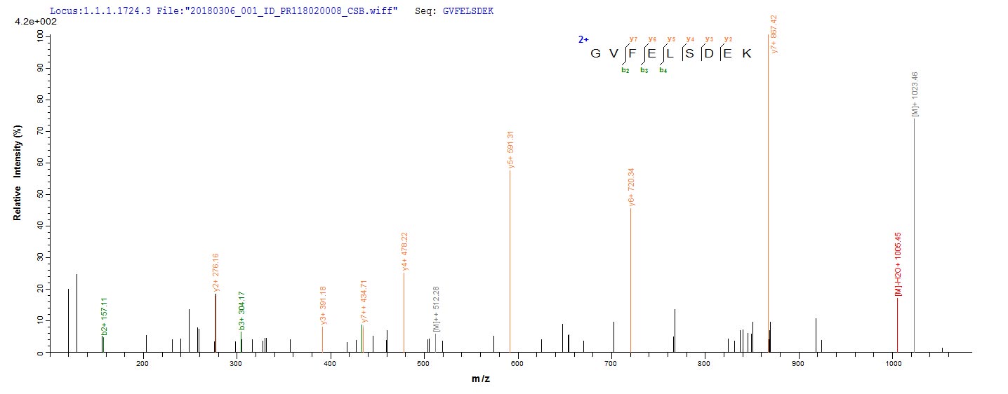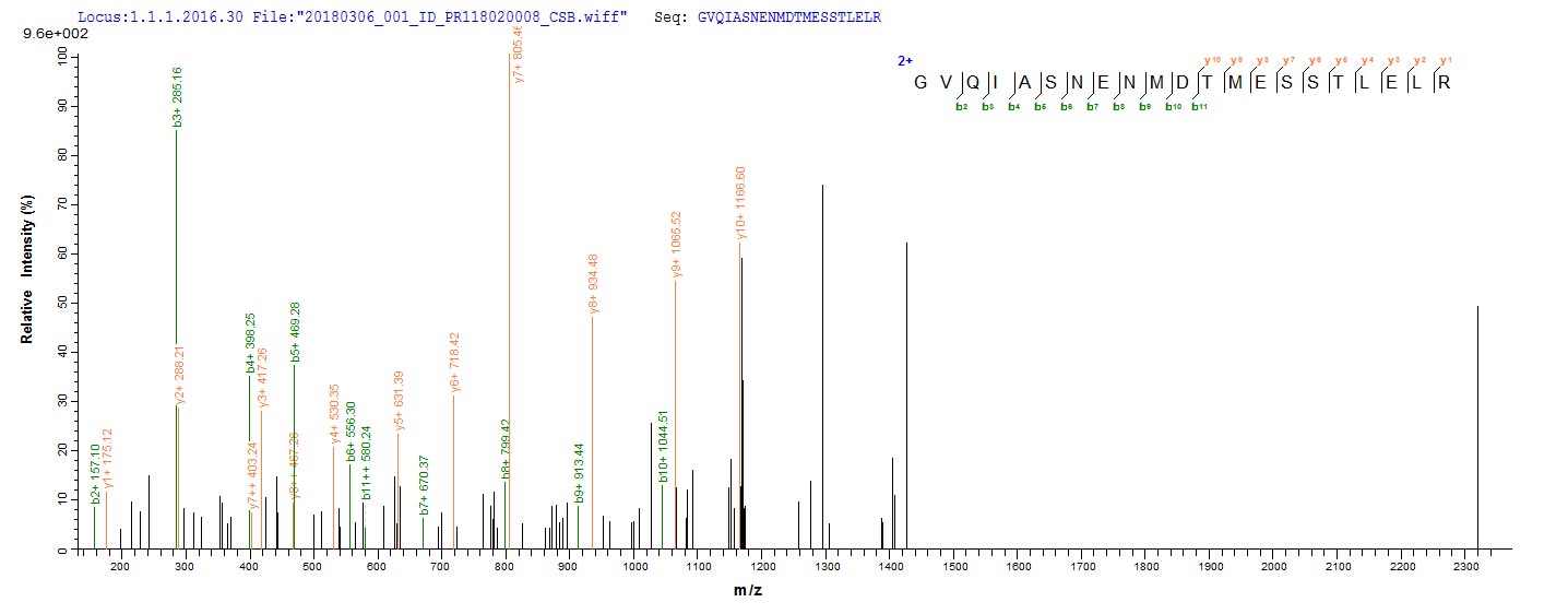 Based on the SEQUEST from database of E.coli host and target protein, the LC-MS/MS Analysis result of CSB-EP630945IFY could indicate that this peptide derived from E.coli-expressed Influenza A virus (strain A/Port Chalmers/1/1973 H3N2) NP.