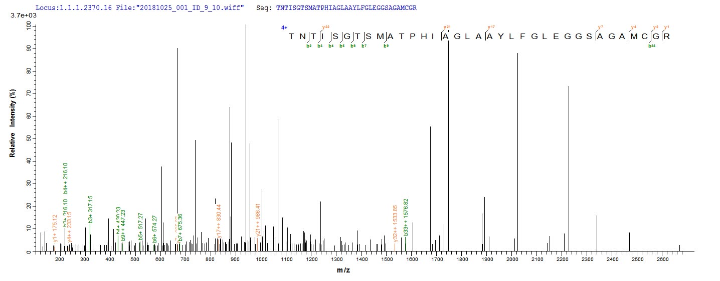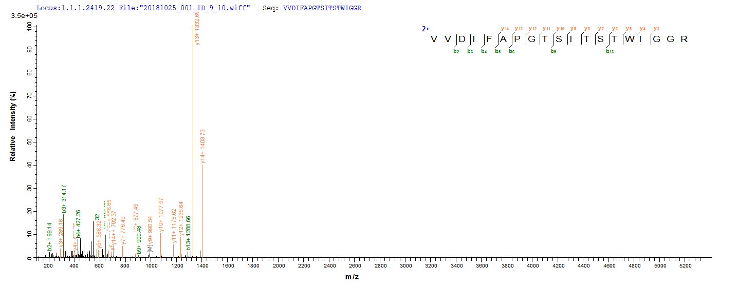 Based on the SEQUEST from database of E.coli host and target protein, the LC-MS/MS Analysis result of CSB-EP737896LCAT could indicate that this peptide derived from E.coli-expressed Lecanicillium psalliotae (Verticillium psalliotae) N/A.