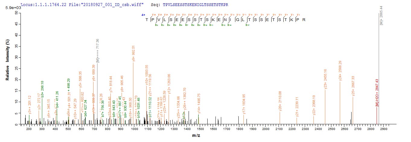 Based on the SEQUEST from database of Yeast host and target protein, the LC-MS/MS Analysis result of CSB-YP322675MHZ could indicate that this peptide derived from Yeast-expressed Moraxella bovis N/A.