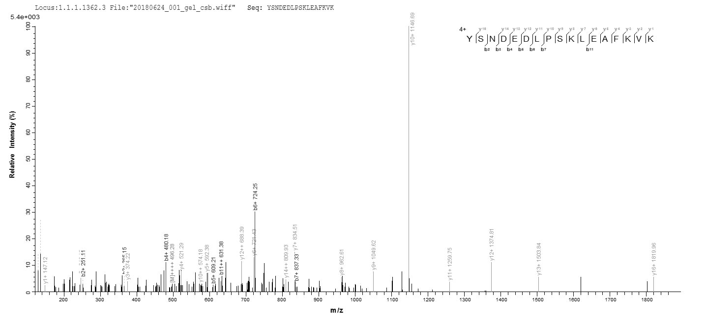 Based on the SEQUEST from database of E.coli host and target protein, the LC-MS/MS Analysis result of CSB-EP001490MO could indicate that this peptide derived from E.coli-expressed Mus musculus (Mouse) Aif1.