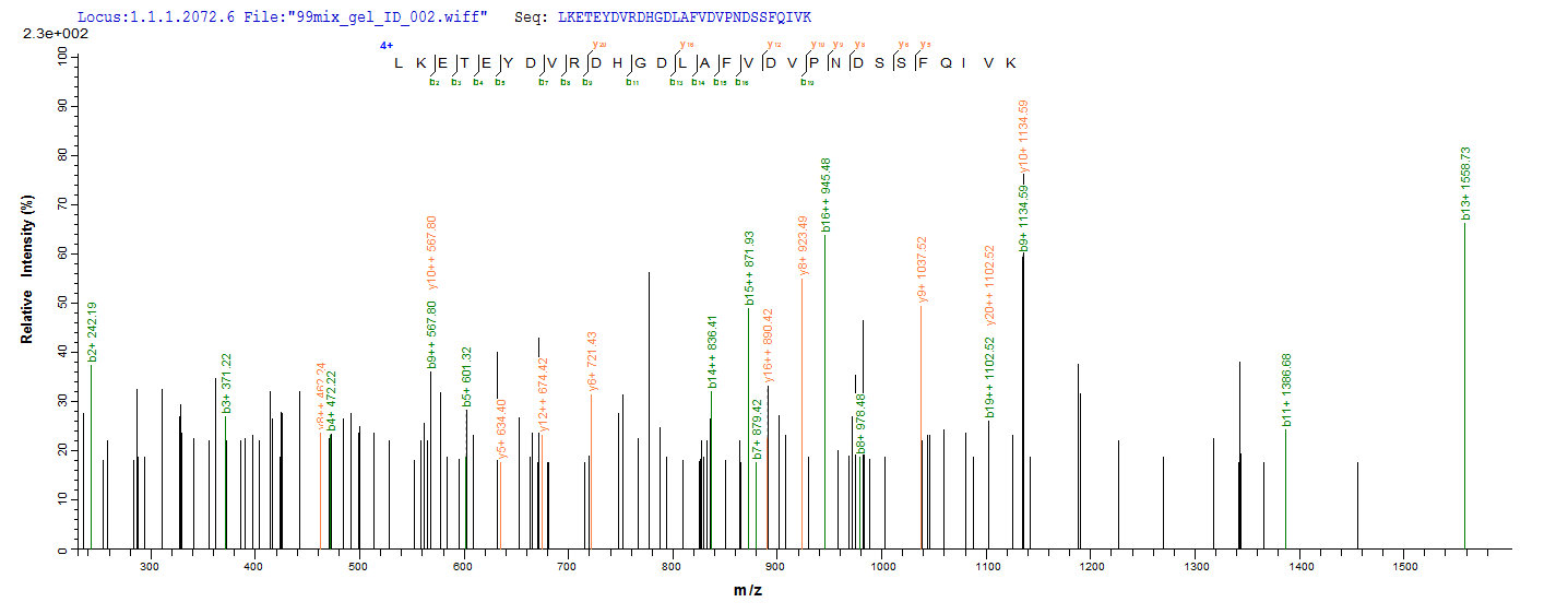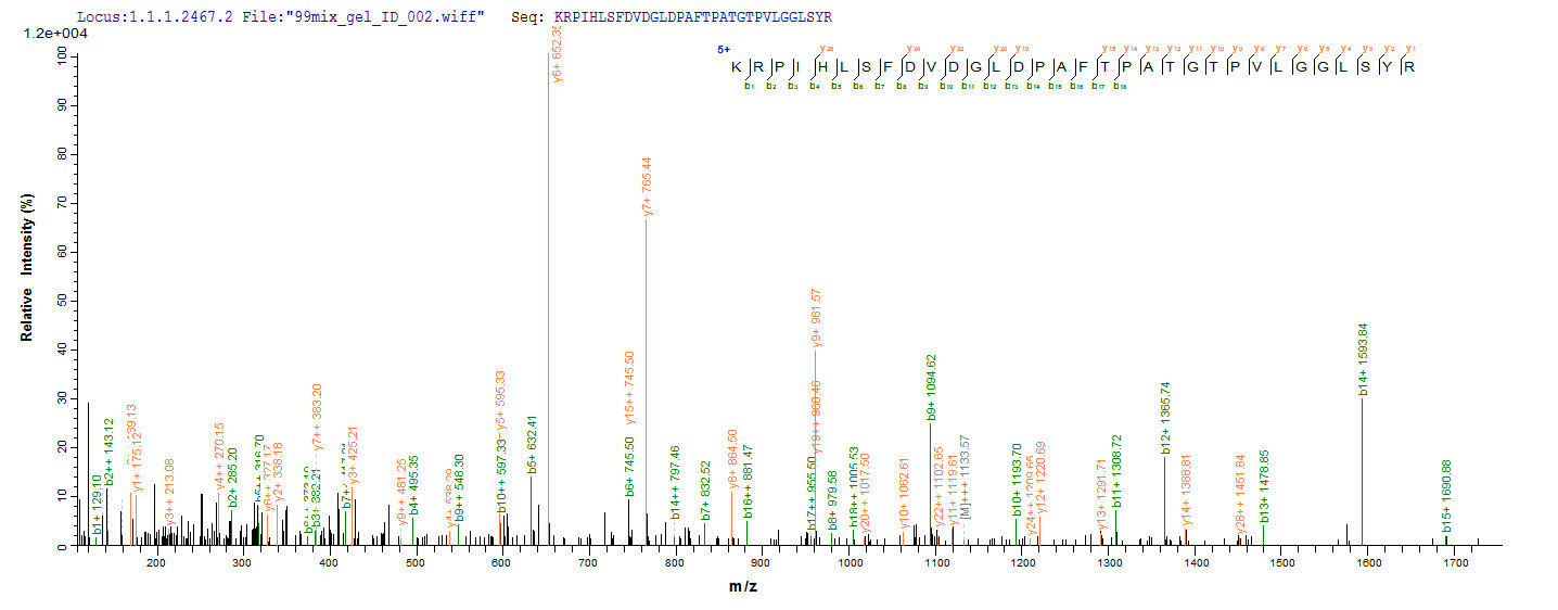 Based on the SEQUEST from database of Yeast host and target protein, the LC-MS/MS Analysis result of CSB-YP733775MO could indicate that this peptide derived from Yeast-expressed Mus musculus (Mouse) Arg1.