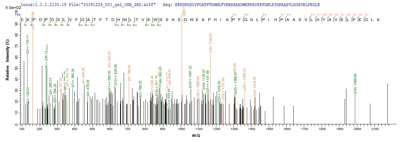 Based on the SEQUEST from database of E.coli host and target protein, the LC-MS/MS Analysis result of CSB-EP002600MO could indicate that this peptide derived from E.coli-expressed Mus musculus (Mouse) Bcat1.