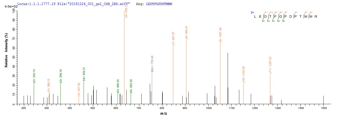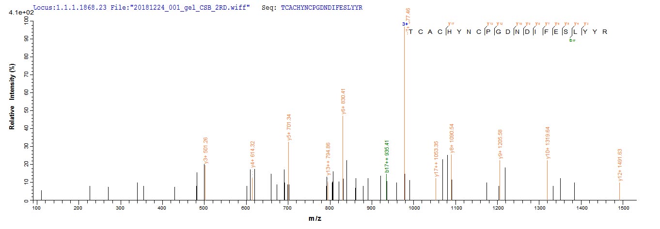 Based on the SEQUEST from database of E.coli host and target protein, the LC-MS/MS Analysis result of CSB-EP006147MO could indicate that this peptide derived from E.coli-expressed Mus musculus (Mouse) Ctgf.