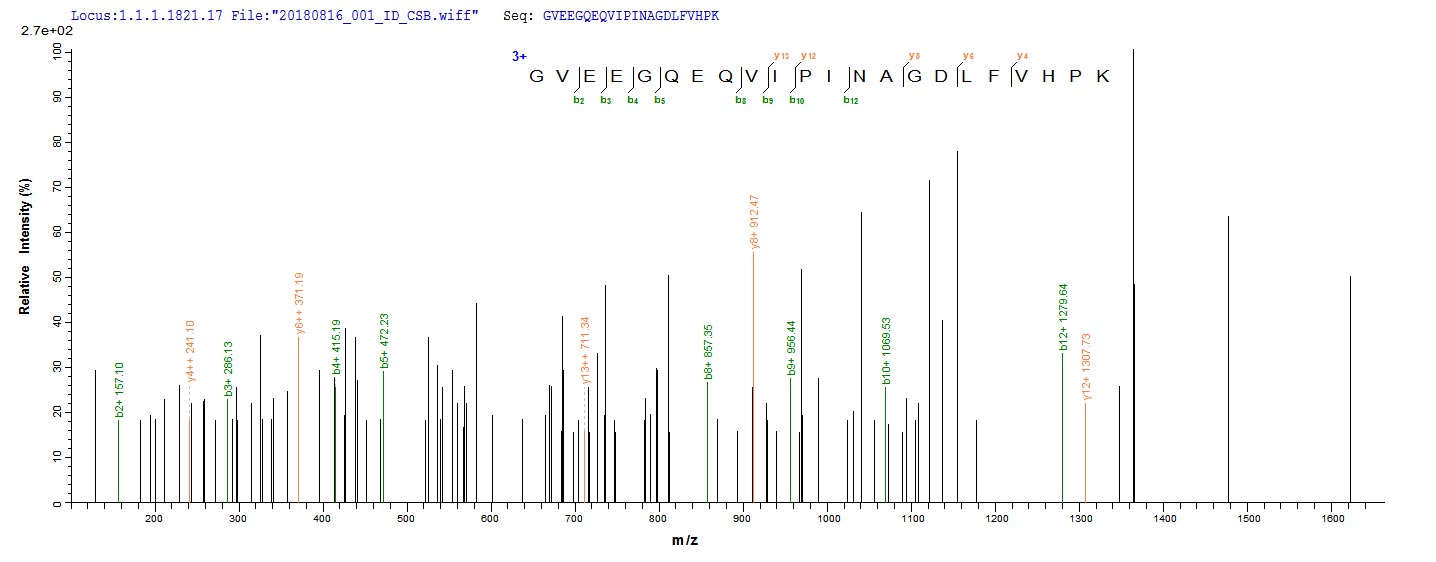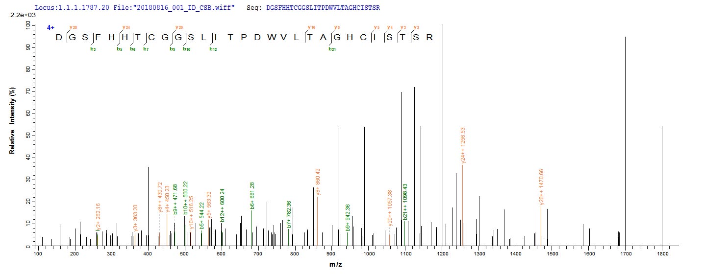 Based on the SEQUEST from database of Yeast host and target protein, the LC-MS/MS Analysis result of CSB-YP875103MO could indicate that this peptide derived from Yeast-expressed Mus musculus (Mouse) Cela3b.