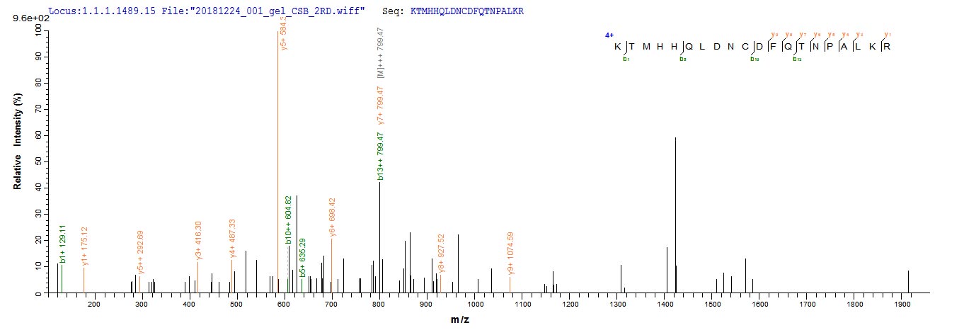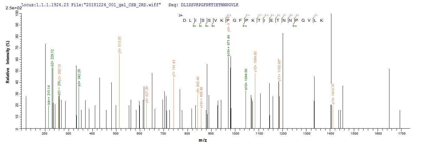 Based on the SEQUEST from database of E.coli host and target protein, the LC-MS/MS Analysis result of CSB-EP006095MO could indicate that this peptide derived from E.coli-expressed Mus musculus (Mouse) Cst7.