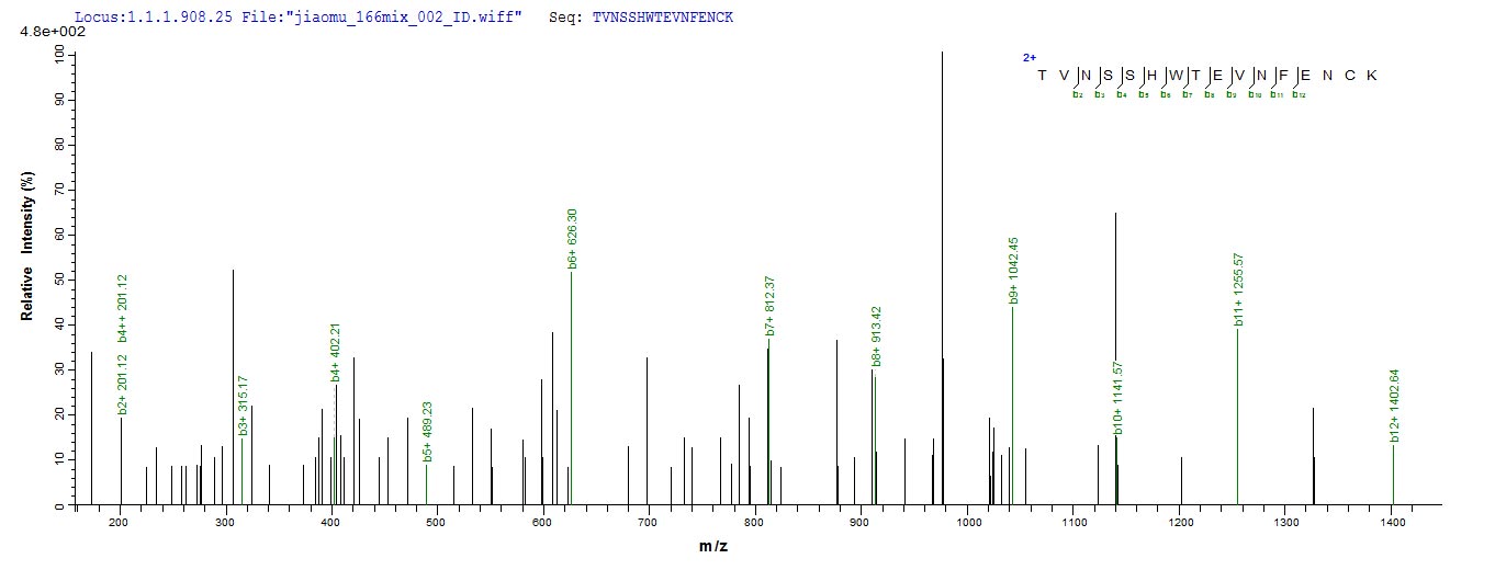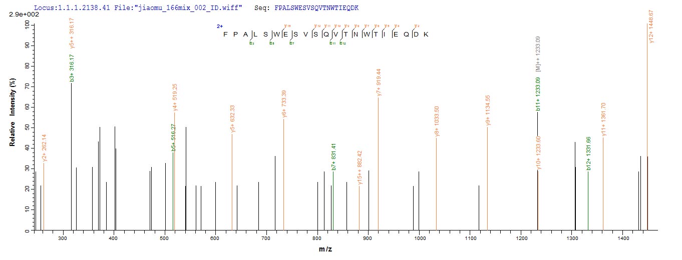 Based on the SEQUEST from database of E.coli host and target protein, the LC-MS/MS Analysis result of CSB-EP818362MO could indicate that this peptide derived from E.coli-expressed Mus musculus (Mouse) Il31ra.