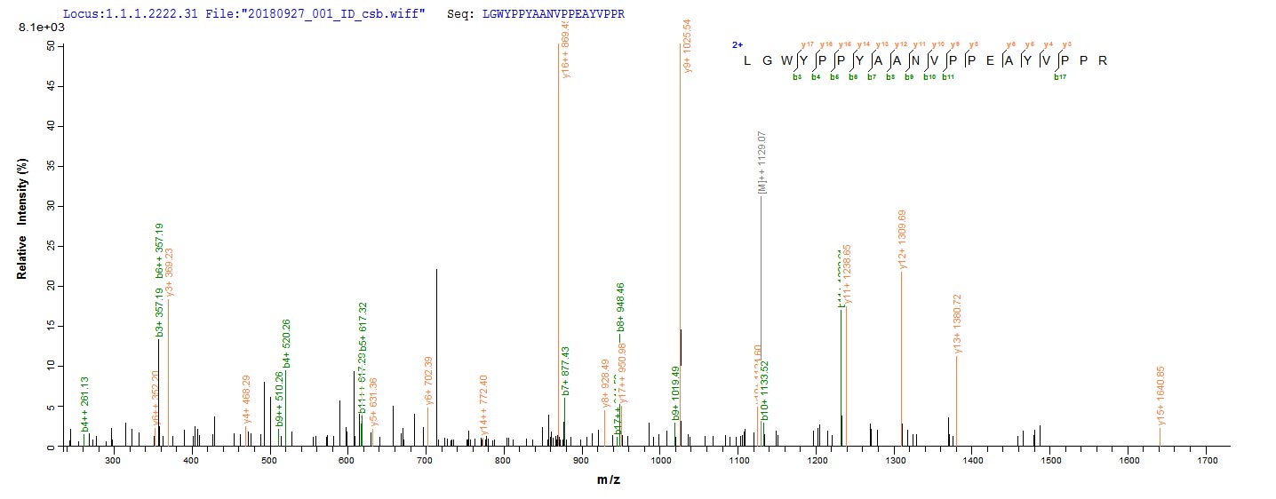 Based on the SEQUEST from database of E.coli host and target protein, the LC-MS/MS Analysis result of CSB-EP013040MO could indicate that this peptide derived from E.coli-expressed Mus musculus (Mouse) Loxl1.