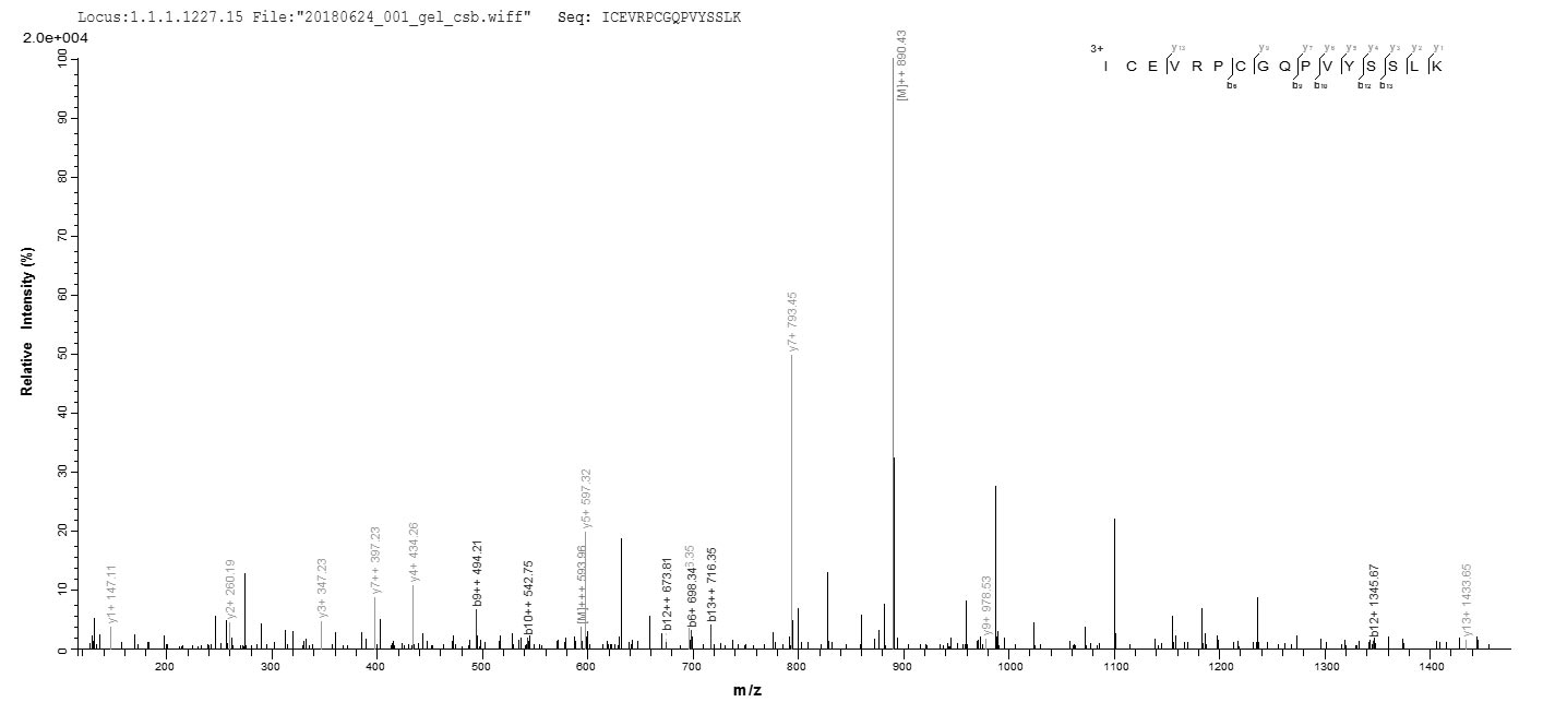 Based on the SEQUEST from database of E.coli host and target protein, the LC-MS/MS Analysis result of CSB-EP006463MO could indicate that this peptide derived from E.coli-expressed Mus musculus (Mouse) Cyr61.