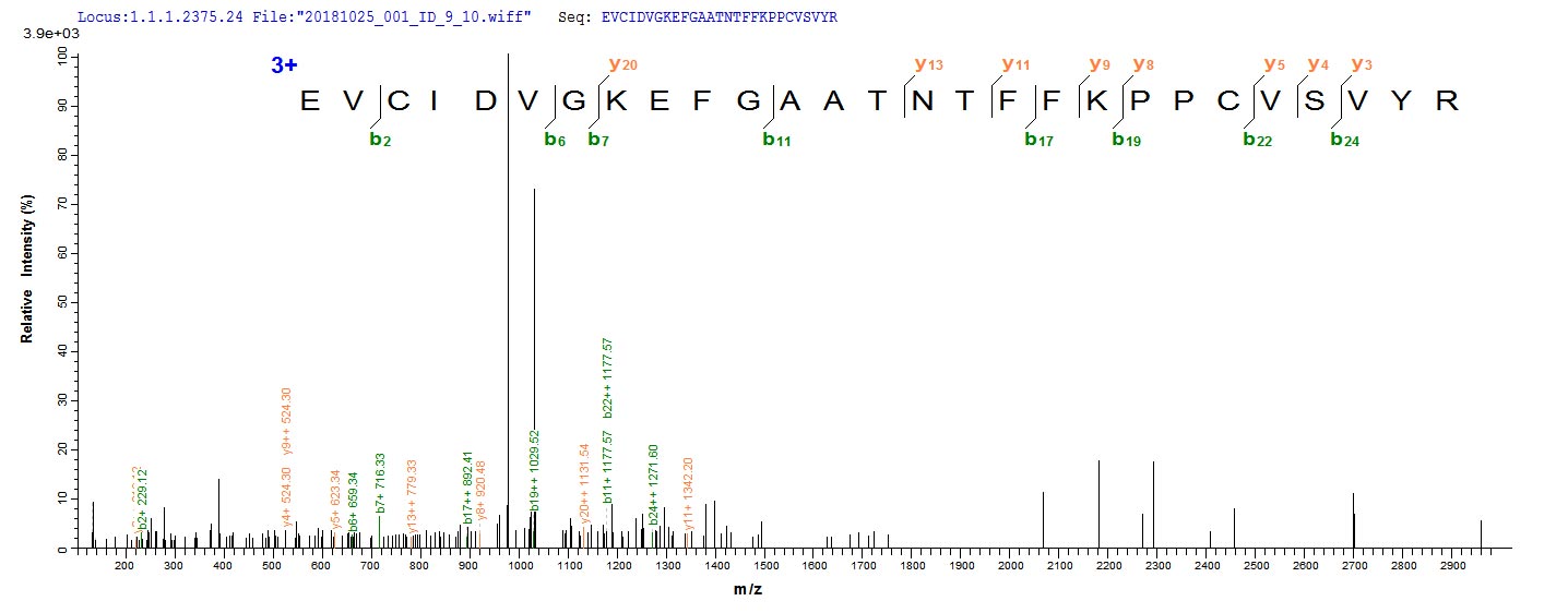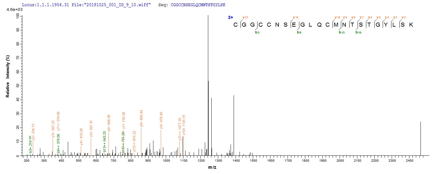 Based on the SEQUEST from database of E.coli host and target protein, the LC-MS/MS Analysis result of CSB-EP025835MO could indicate that this peptide derived from E.coli-expressed Mus musculus (Mouse) Vegfc.