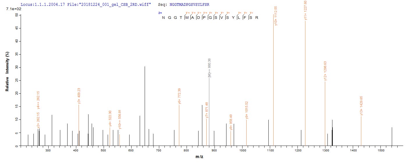 Based on the SEQUEST from database of E.coli host and target protein, the LC-MS/MS Analysis result of CSB-EP352276MLA could indicate that this peptide derived from E.coli-expressed Mycobacterium paratuberculosis (strain ATCC BAA-968 / K-10) MAP_1030.