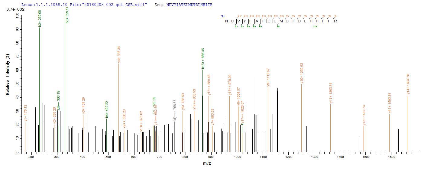 Based on the SEQUEST from database of E.coli host and target protein, the LC-MS/MS Analysis result of CSB-EP607476OFG could indicate that this peptide derived from E.coli-expressed Oryza sativa subsp. japonica (Rice) MPK5.