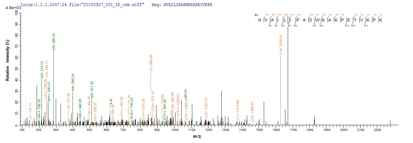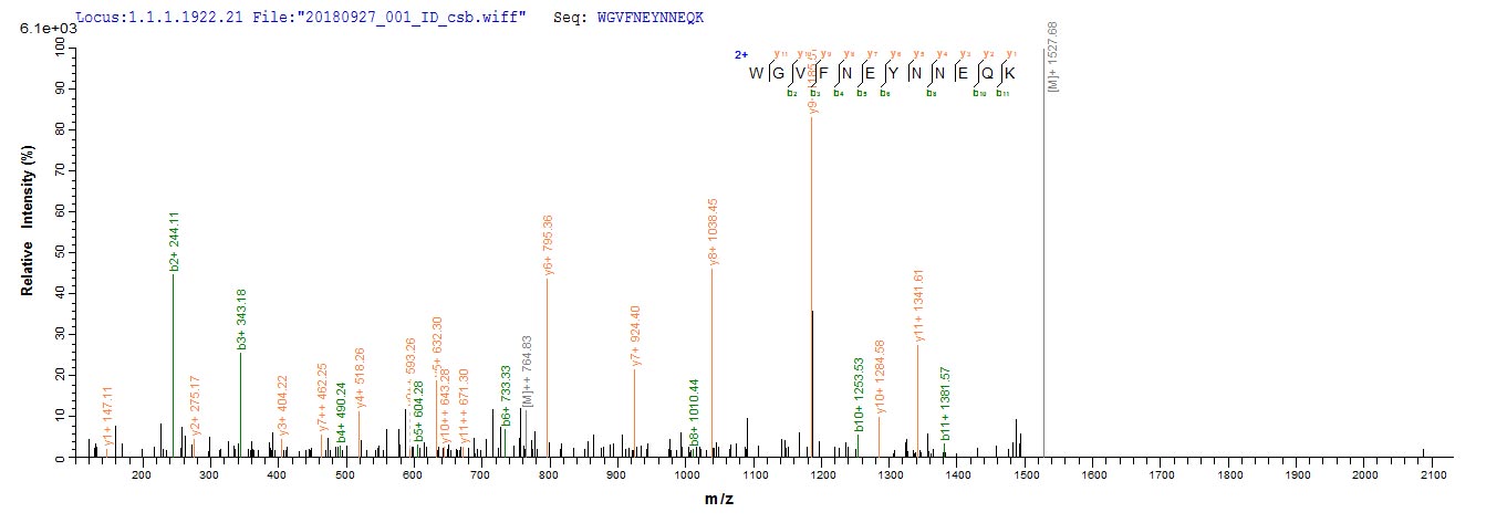 Based on the SEQUEST from database of E.coli host and target protein, the LC-MS/MS Analysis result of CSB-EP886948PI could indicate that this peptide derived from E.coli-expressed Sus scrofa (Pig) CLCA1.