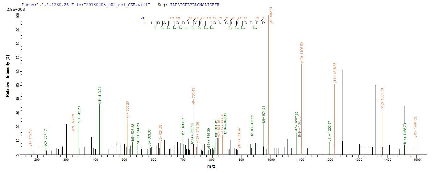 Based on the SEQUEST from database of E.coli host and target protein, the LC-MS/MS Analysis result of CSB-EP342468EZX could indicate that this peptide derived from E.coli-expressed Pseudomonas aeruginosa (strain ATCC 15692 / DSM 22644 / CIP 104116 / JCM 14847 / LMG 12228 / 1C / PRS 101 / PAO1) lpxC.