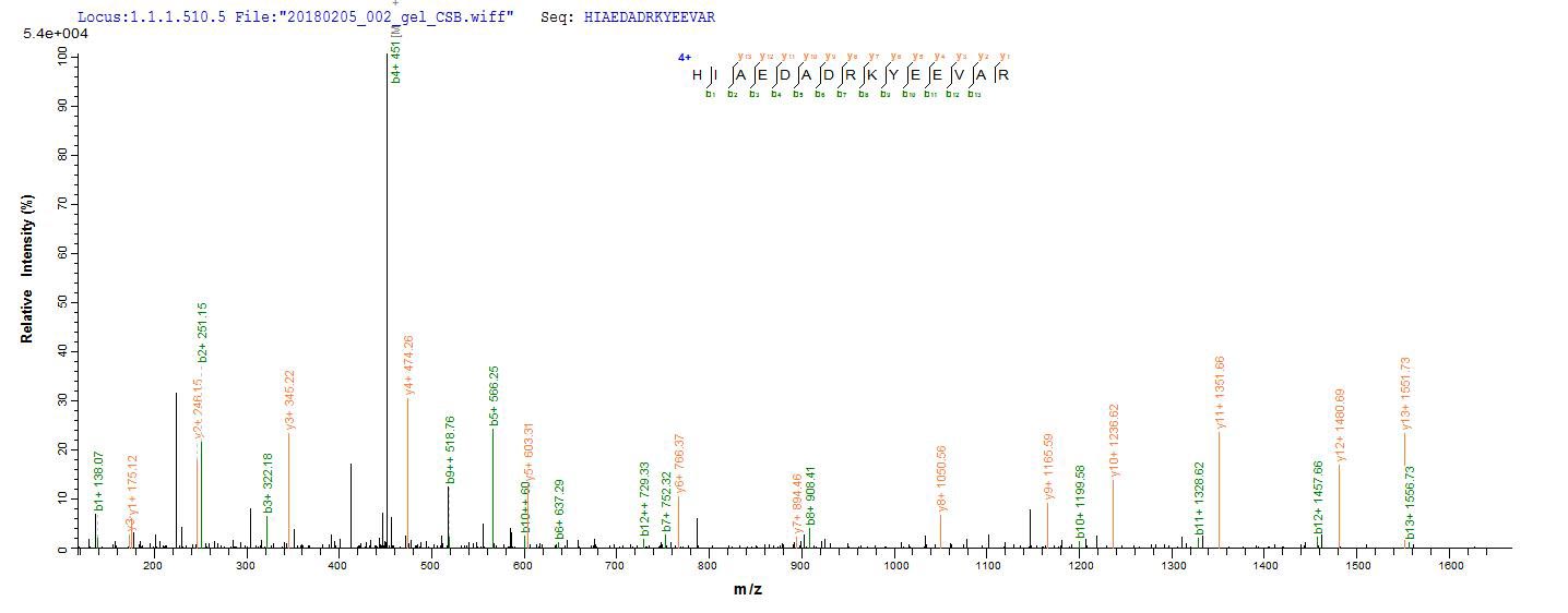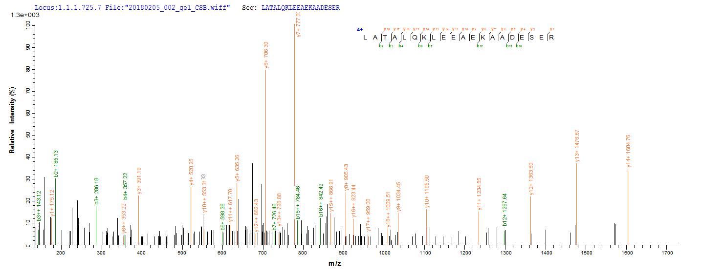Based on the SEQUEST from database of Baculovirus host and target protein, the LC-MS/MS Analysis result of CSB-BP024104RB could indicate that this peptide derived from Baculovirus-expressed Oryctolagus cuniculus (Rabbit) TPM1.