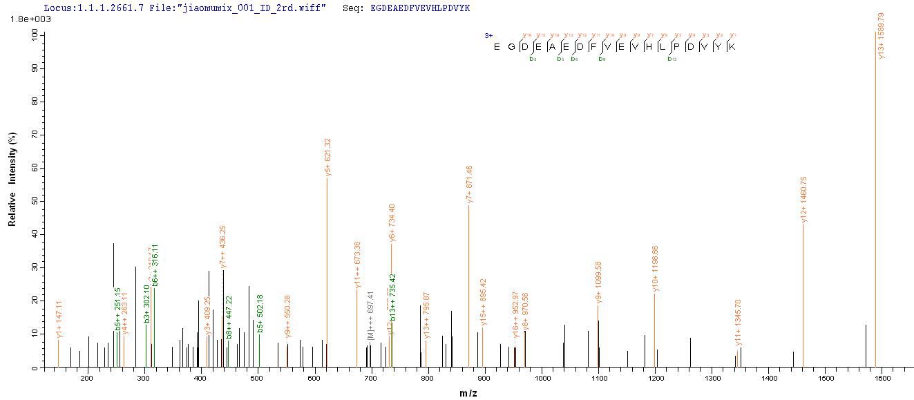 Based on the SEQUEST from database of E.coli host and target protein, the LC-MS/MS Analysis result of CSB-EP526040RJA could indicate that this peptide derived from E.coli-expressed Rabies virus (strain CVS-11) (RABV) G.