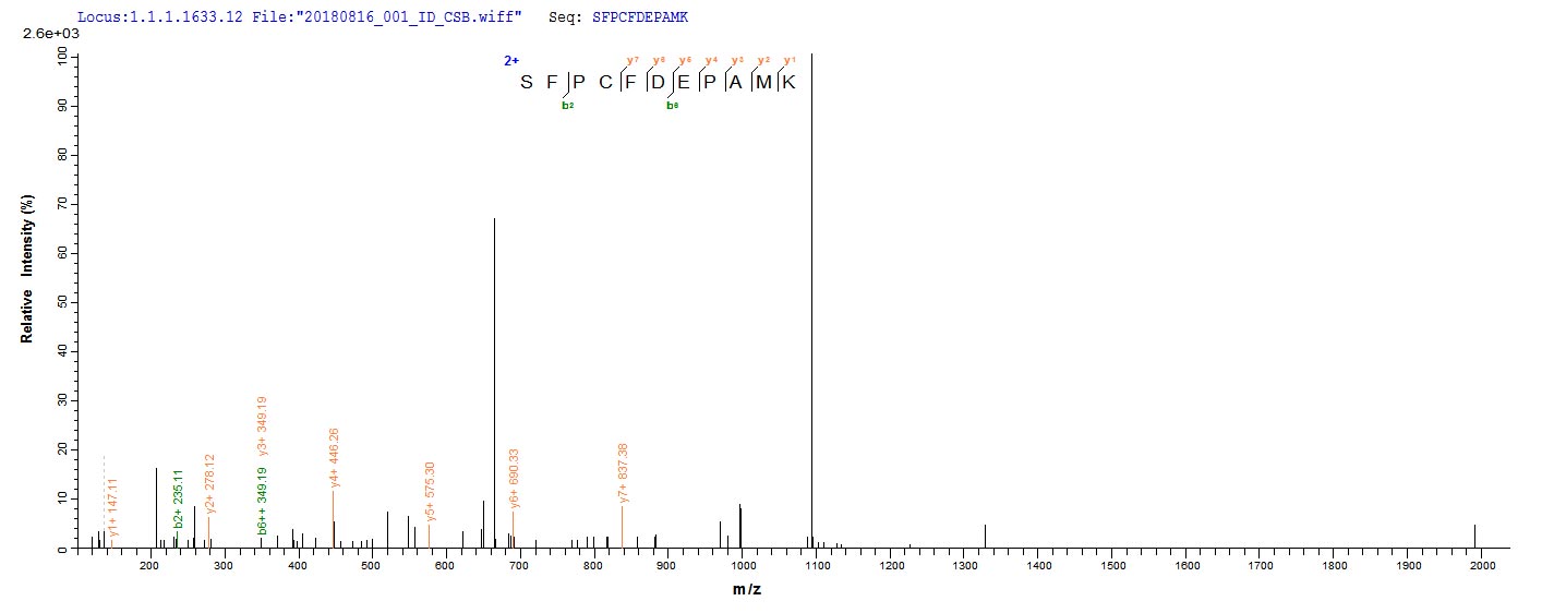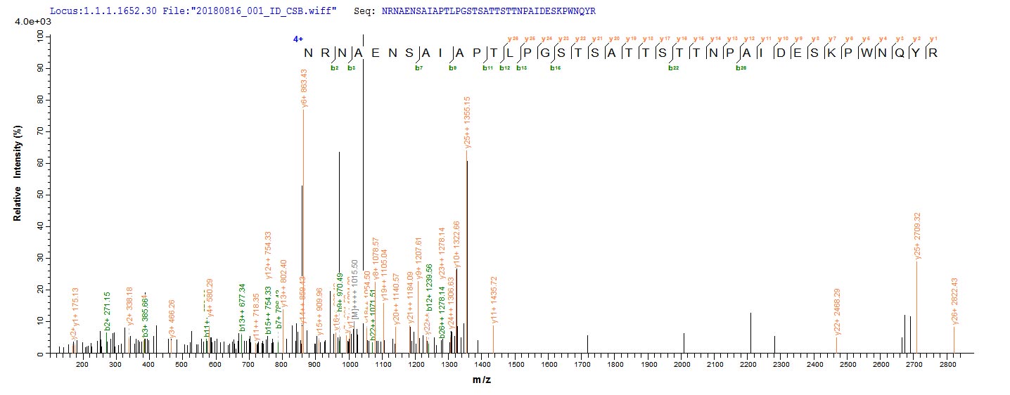 Based on the SEQUEST from database of E.coli host and target protein, the LC-MS/MS Analysis result of CSB-EP001827RA could indicate that this peptide derived from E.coli-expressed Rattus norvegicus (Rat) Anpep.