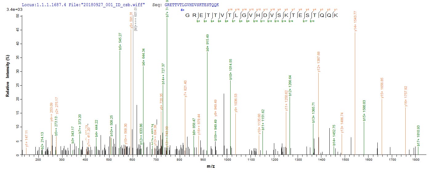 Based on the SEQUEST from database of E.coli host and target protein, the LC-MS/MS Analysis result of CSB-EP357723RA could indicate that this peptide derived from E.coli-expressed Rattus norvegicus (Rat) Mcpt1.