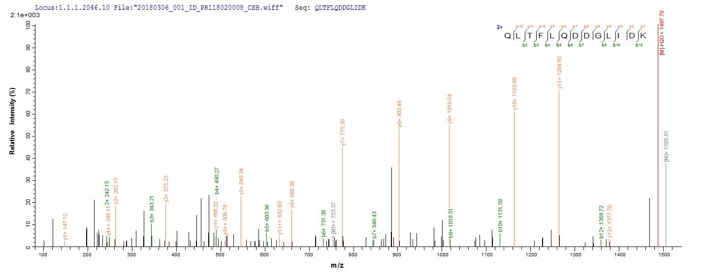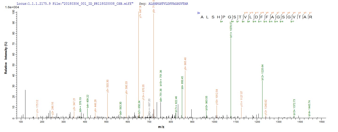 Based on the SEQUEST from database of E.coli host and target protein, the LC-MS/MS Analysis result of CSB-EP318583RLE could indicate that this peptide derived from E.coli-expressed Rhodobacter sphaeroides (Rhodopseudomonas sphaeroides) rsrIM.