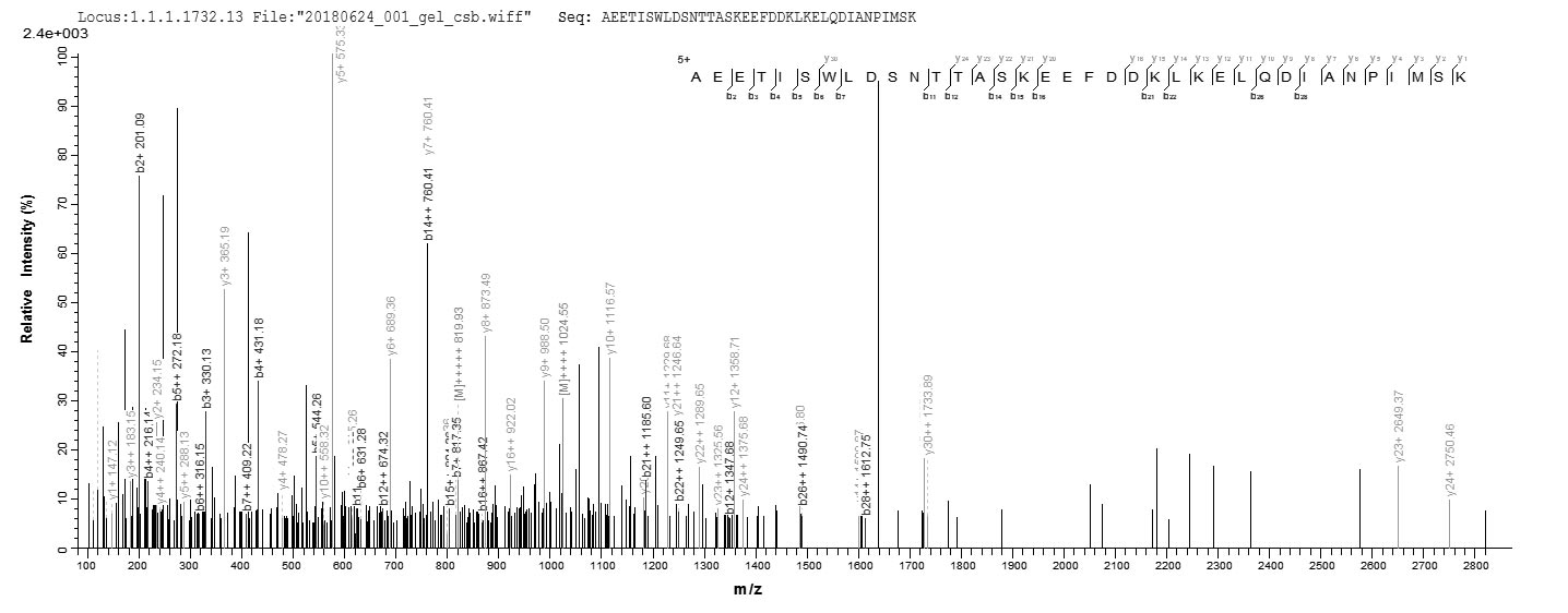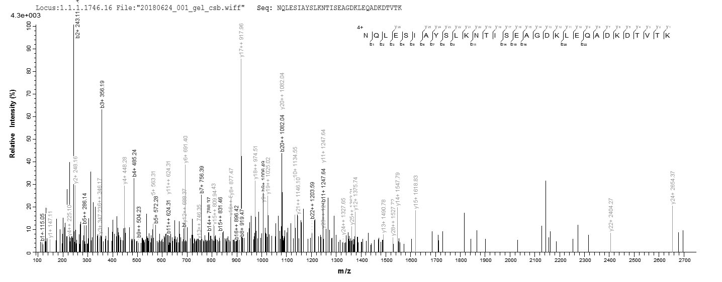 Based on the SEQUEST from database of E.coli host and target protein, the LC-MS/MS Analysis result of CSB-EP319915SVG could indicate that this peptide derived from E.coli-expressed Saccharomyces cerevisiae (strain ATCC 204508 / S288c) (Baker's yeast) SSA1.