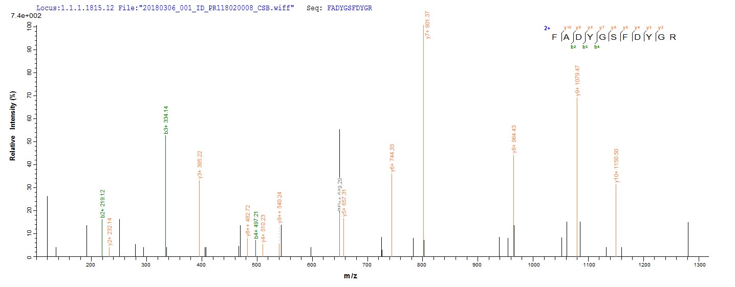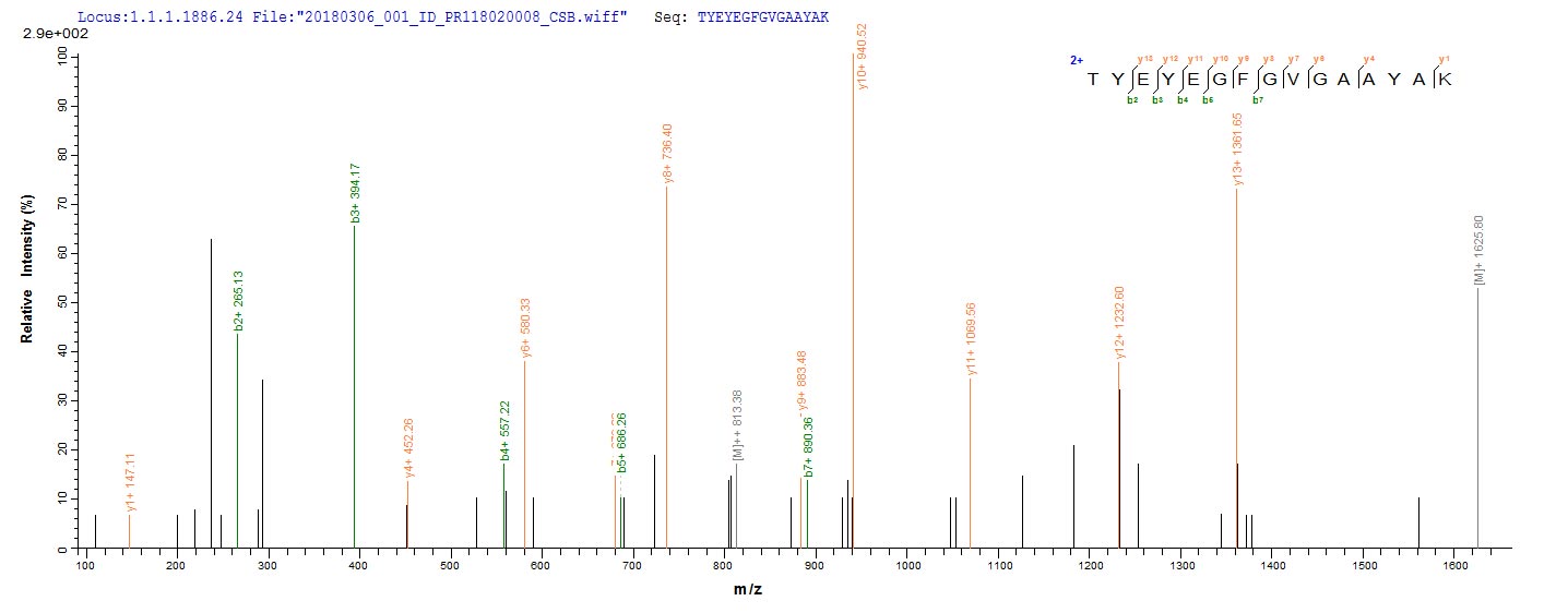 Based on the SEQUEST from database of E.coli host and target protein, the LC-MS/MS Analysis result of CSB-EP334291SXB could indicate that this peptide derived from E.coli-expressed Salmonella typhimurium (strain LT2 / SGSC1412 / ATCC 700720) ompD.