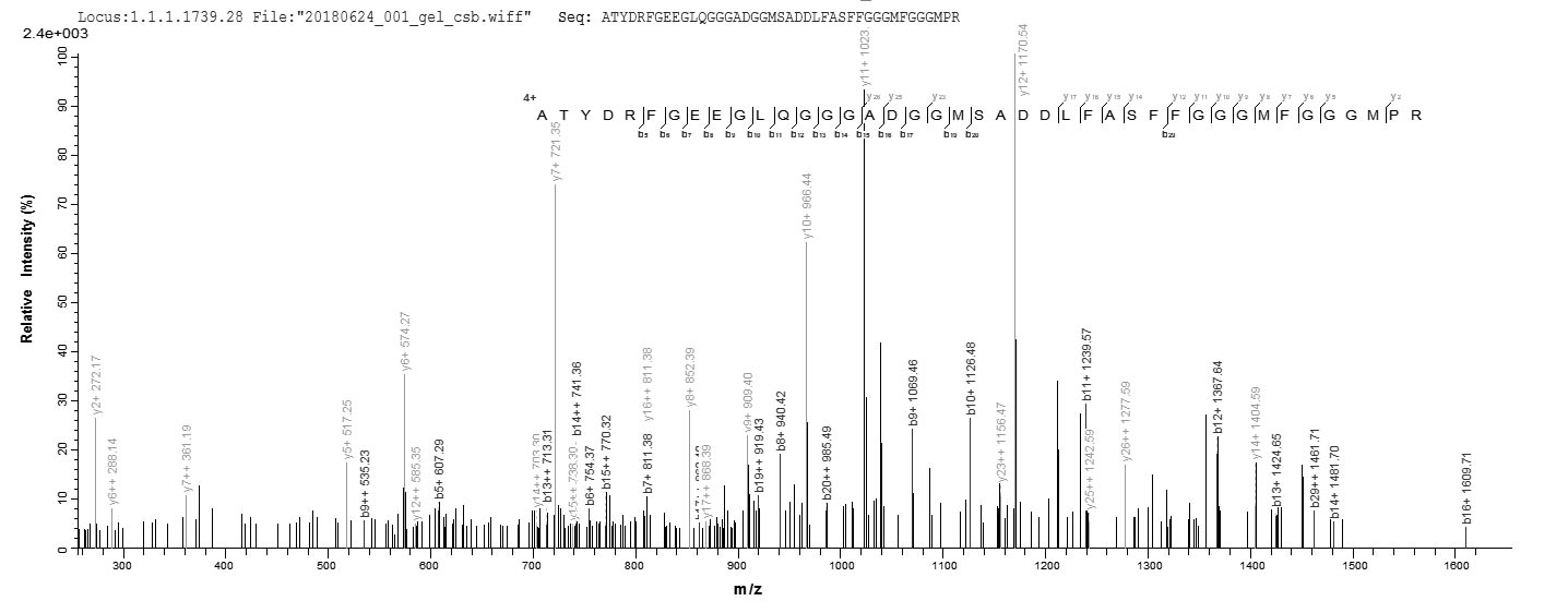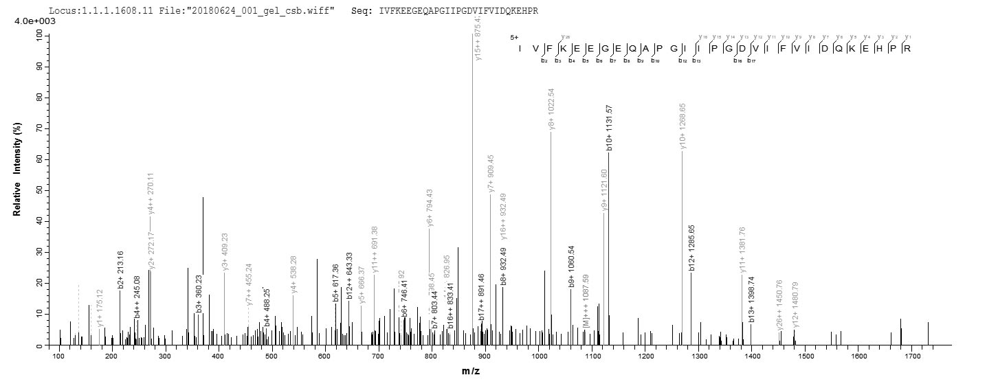 Based on the SEQUEST from database of E.coli host and target protein, the LC-MS/MS Analysis result of CSB-EP524885SXV could indicate that this peptide derived from E.coli-expressed Schizosaccharomyces pombe (strain 972 / ATCC 24843) (Fission yeast) mas5.