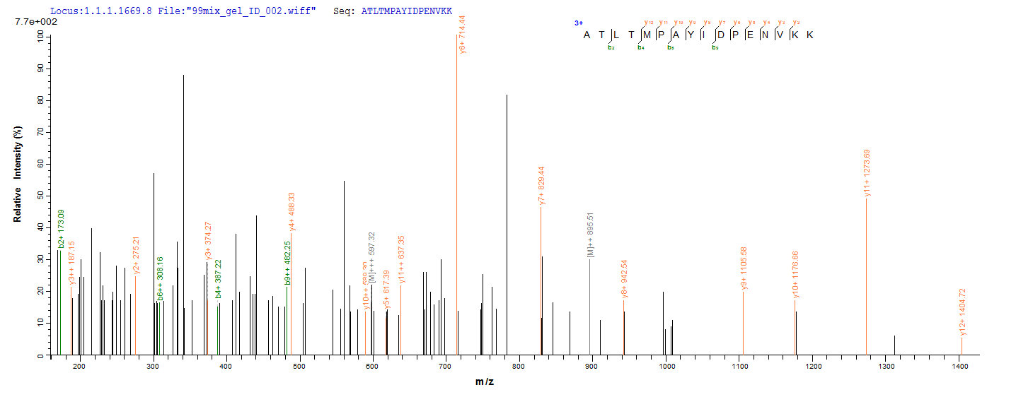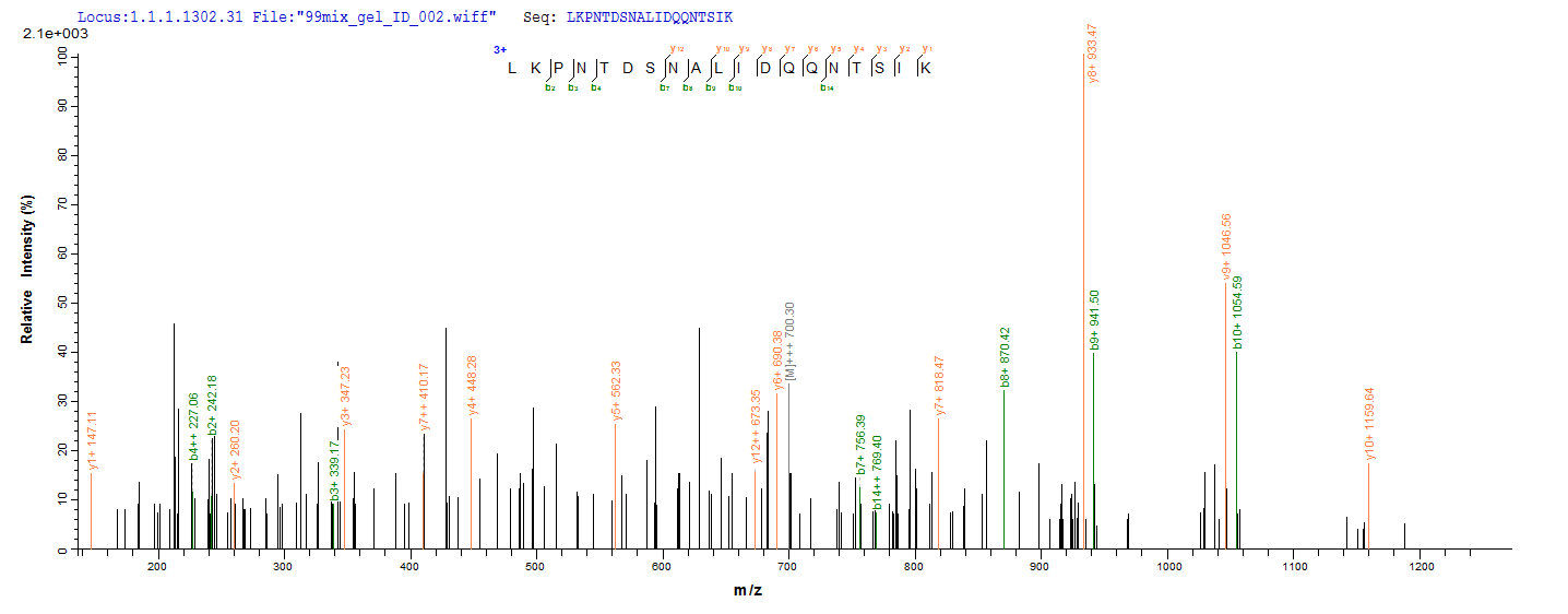 Based on the SEQUEST from database of Yeast host and target protein, the LC-MS/MS Analysis result of CSB-YP692021FLB could indicate that this peptide derived from Yeast-expressed Staphylococcus aureus (strain COL) clfA.