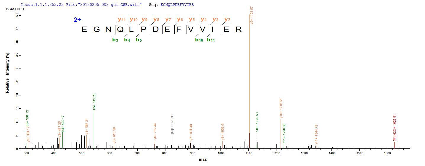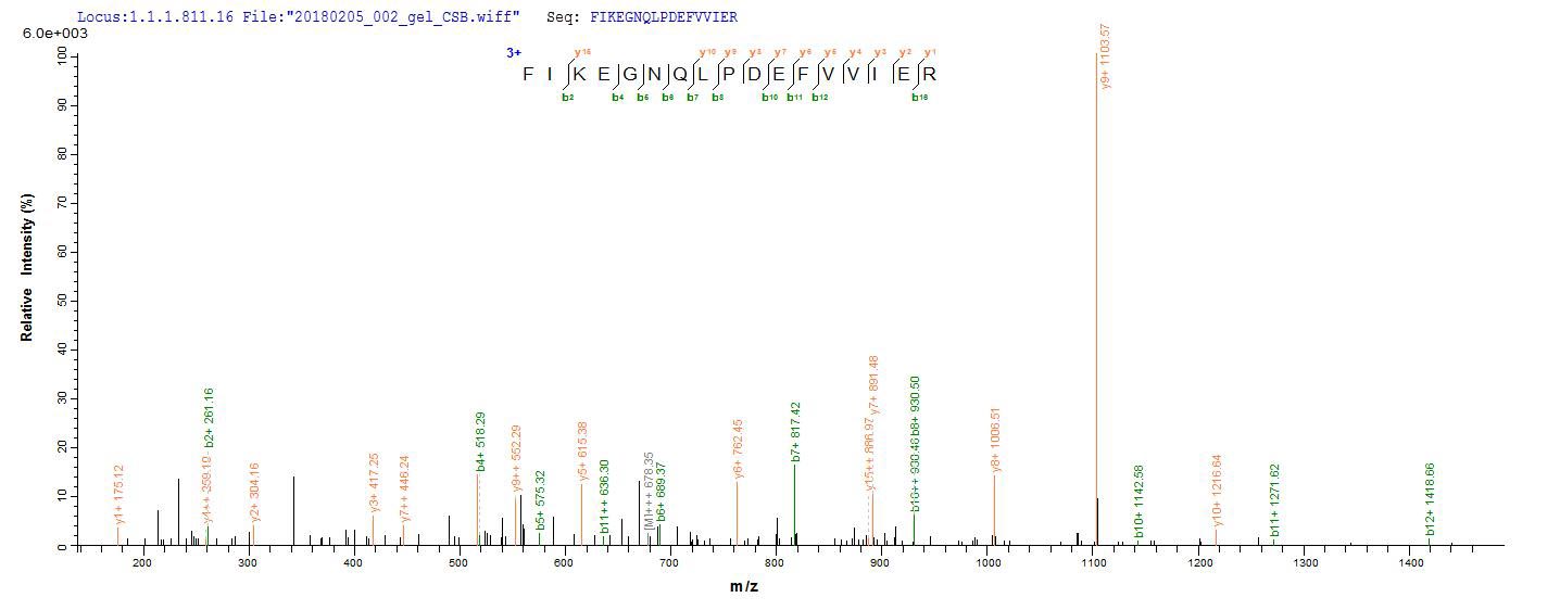 Based on the SEQUEST from database of E.coli host and target protein, the LC-MS/MS Analysis result of CSB-EP314690FMW could indicate that this peptide derived from E.coli-expressed Streptococcus pneumoniae serotype 4 (strain ATCC BAA-334 / TIGR4) ply.