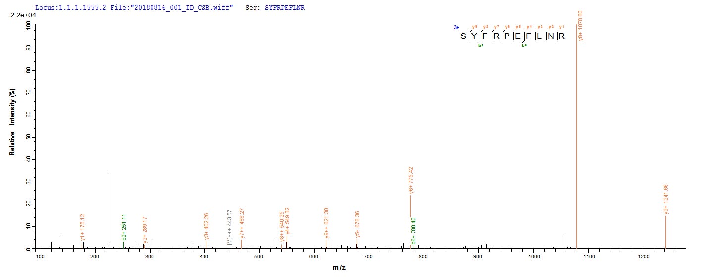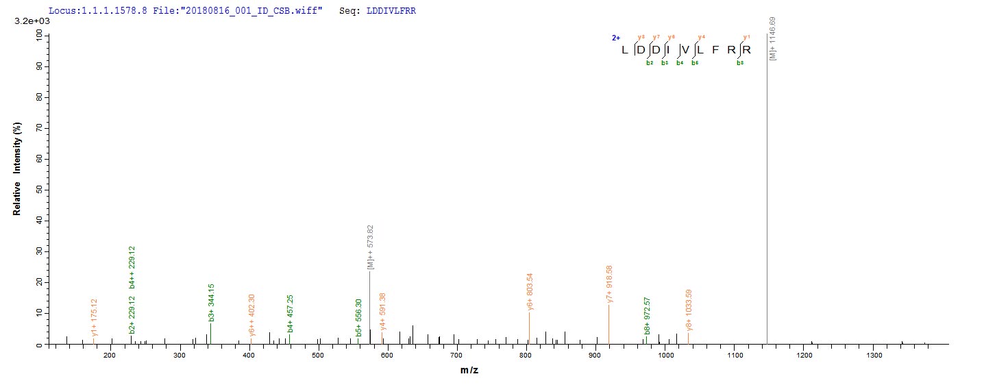 Based on the SEQUEST from database of E.coli host and target protein, the LC-MS/MS Analysis result of CSB-EP517681TQY could indicate that this peptide derived from E.coli-expressed Trypanosoma cruzi HSP100.