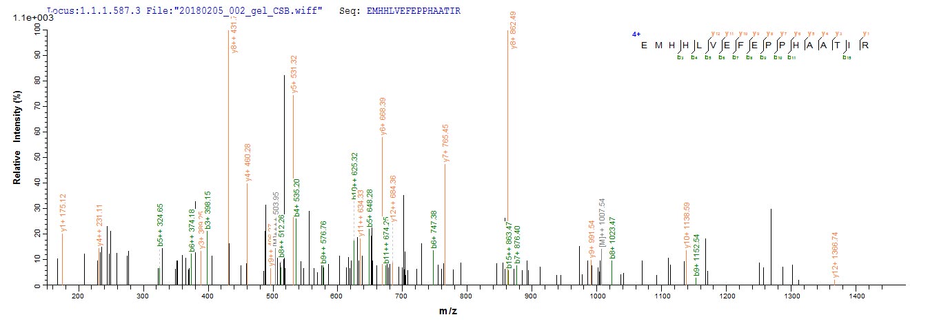 Based on the SEQUEST from database of E.coli host and target protein, the LC-MS/MS Analysis result of CSB-EP365905YAC1 could indicate that this peptide derived from E.coli-expressed Yellow fever virus (strain 17D vaccine) (YFV) N/A.