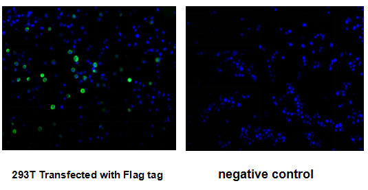 Immunofluorescence staining of 293T cells transfected with Flag tag by CSB-MA000021M0m at 1:300, counter-stained with DAPI. The cells were fixed in 4% formaldehyde and blocked in 10% normal Goat Serum. The cells were then incubated with the antibody overnight at 4°C. The secondary antibody was Alexa Fluor 488-congugated AffiniPure Goat Anti-mouse IgG(H+L). The image on the right is the 293T cells transfected without Flag tag.