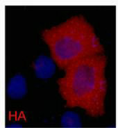 IF analysis of 293 cells transfected with a HA-tag protein,1:2000 dilution (blue DAPI, red anti-HA)
