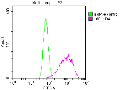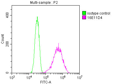 Overlay Peak curve showing A549 cells stained with CSB-MA025318A0m (red line) at 1:200. The cells were fixed in 4% formaldehyde and permeated by 0.2% TritonX-100. Then 10% normal goat serum was Incubated to block non-specific protein-protein interactions followed by the antibody (1μg/1*106cells) for 1 h at 4°C. The secondary antibody used was FITC-conjugated Goat Anti-Mouse IgG(H+L) at 1/100 dilution for 30min at 4°C. Isotype control antibody (green line) was mouse IgG2b (1μg/1*106cells) used under the same conditions. Acquisition of >10,000 events was performed.