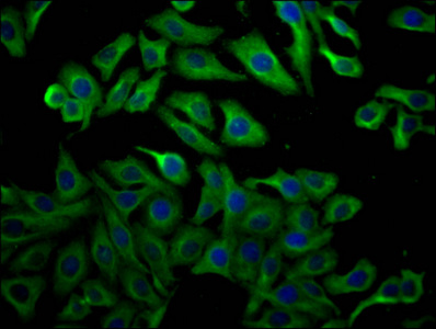 Immunofluorescence staining of Hela cells with CSB-MA025318A0m at 1:100, counter-stained with DAPI. The cells were fixed in 4% formaldehyde, permeated by 0.2% TritonX-100, and blocked in 10% normal Goat Serum. The cells were then incubated with the antibody overnight at 4°C. Nuclear DNA was labeled in blue with DAPI. The secondary antibody was FITC-conjugated AffiniPure Goat Anti-Mouse IgG(H+L).