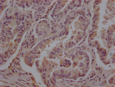 IHC image of CSB-MA025318A0m diluted at 1:200 and staining in paraffin-embedded human lung cancer performed on a Leica BondTM system. After dewaxing and hydration, antigen retrieval was mediated by high pressure in a citrate buffer (pH 6.0). Section was blocked with 10% normal goat serum 30min at 37°C Then primary antibody (1% BSA) was incubated at 4°C overnight. The primary is detected by a Goat anti-Mouse IgG labeled by HRP and visualized using 0.05% DAB.