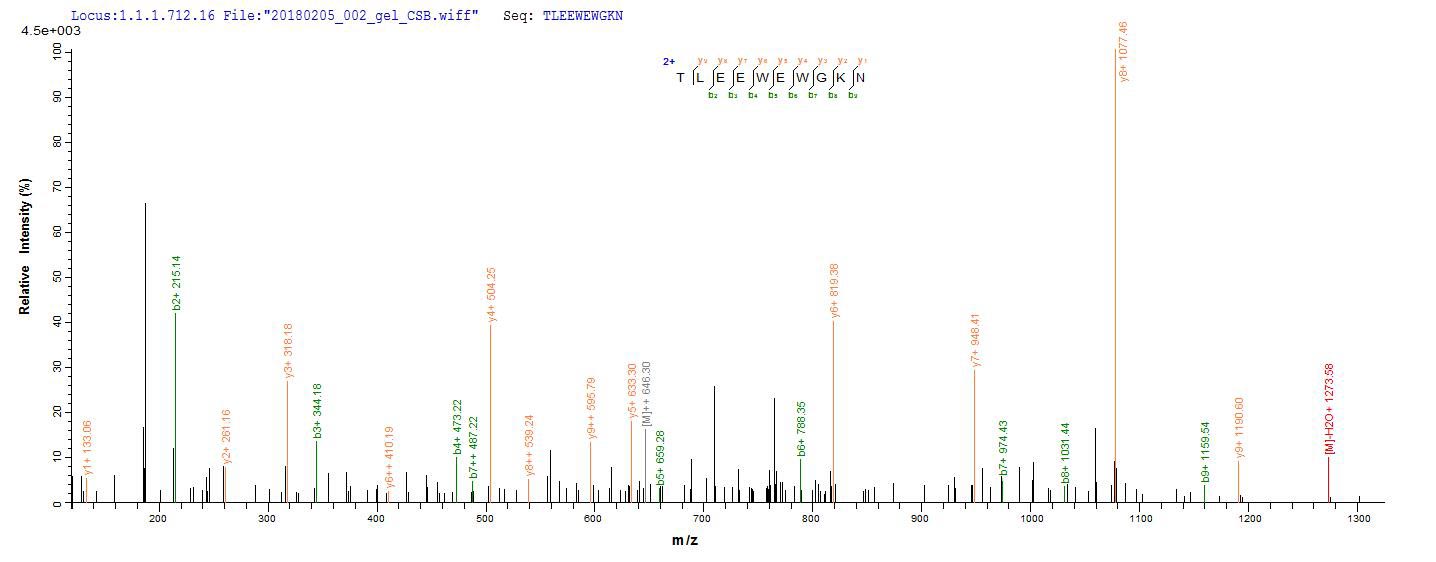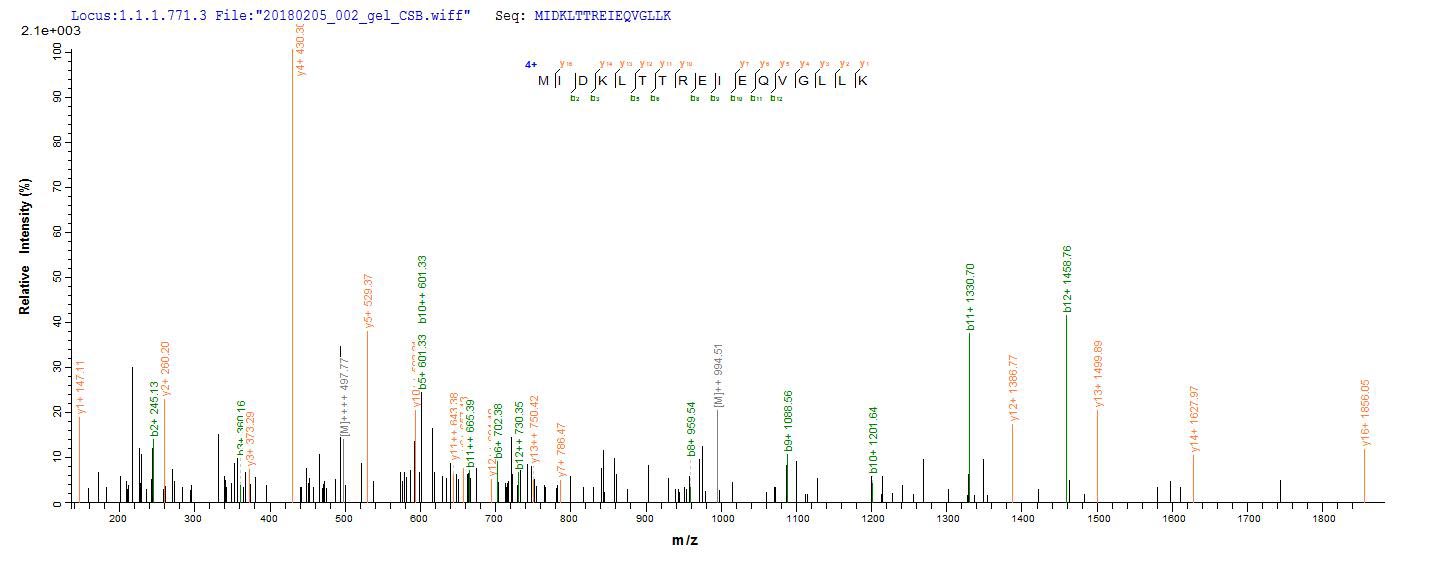 Based on the SEQUEST from database of E.coli host and target protein, the LC-MS/MS Analysis result of CSB-CF889507RFU could indicate that this peptide derived from E.coli-expressed Rotavirus A (isolate RVA/Cow/United States/B223/1983/G10P8[11 ]) (RV-A) glycoprotein 4.