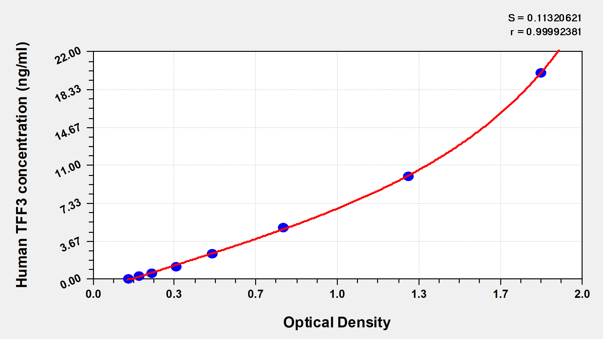 產品評價:我用CSB-EL023433HU檢測了人血漿中TFF3的蛋白濃度,檢測的標準品吸光度OD值為0.1149,0.1472,0.3027,0.5246,0.645,1.0269,1.7359 對應的標準品濃度分別為0,0.312,0.625,1.25,2.5,5,20ng/ml。測得的樣本濃度范圍是2.053732644-14.2