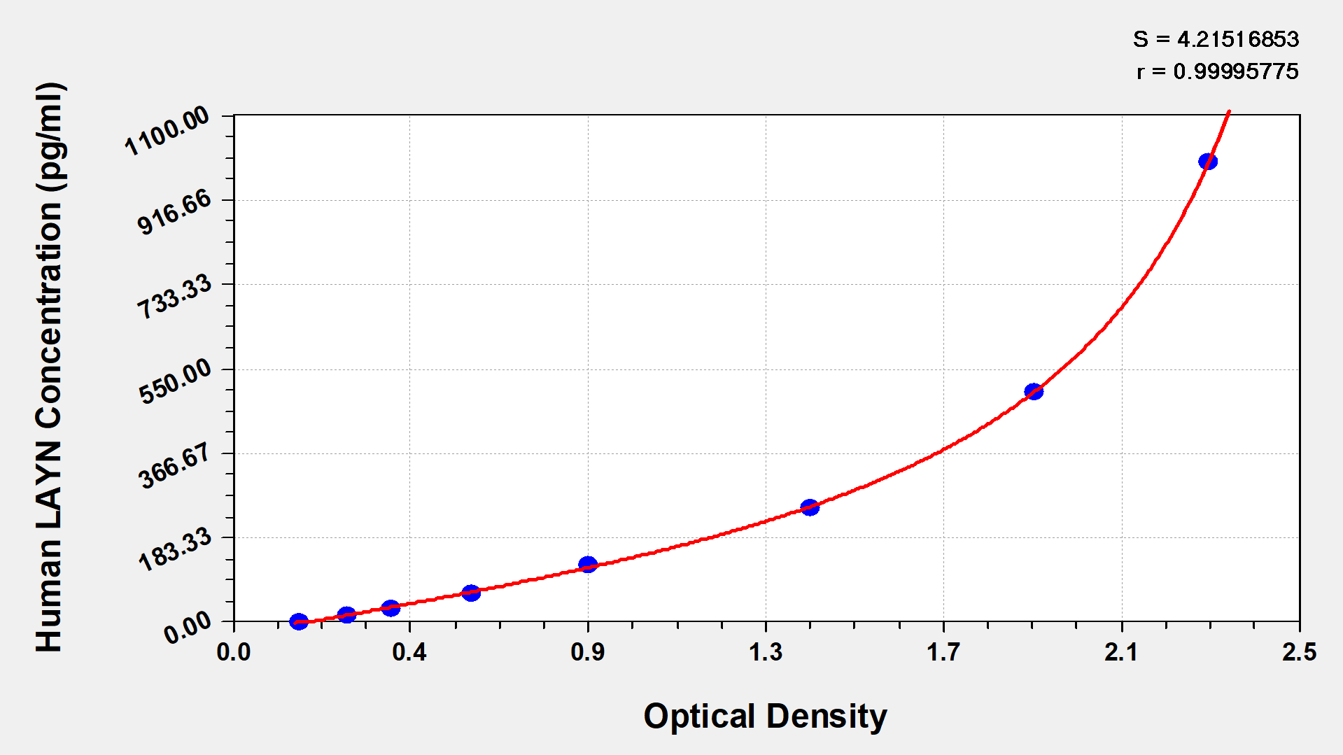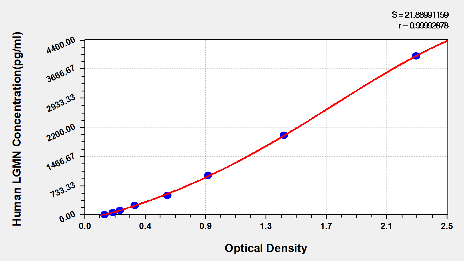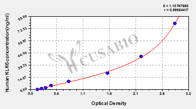 通過(guò)線性范圍來(lái)計(jì)算出實(shí)際的檢測(cè)樣本值,定量試劑盒標(biāo)準(zhǔn)曲線的相關(guān)系數(shù)R大于0.99。以CSB-E07270h(人脂聯(lián)素(ADP)ELISA Kit)為例的標(biāo)準(zhǔn)曲線。