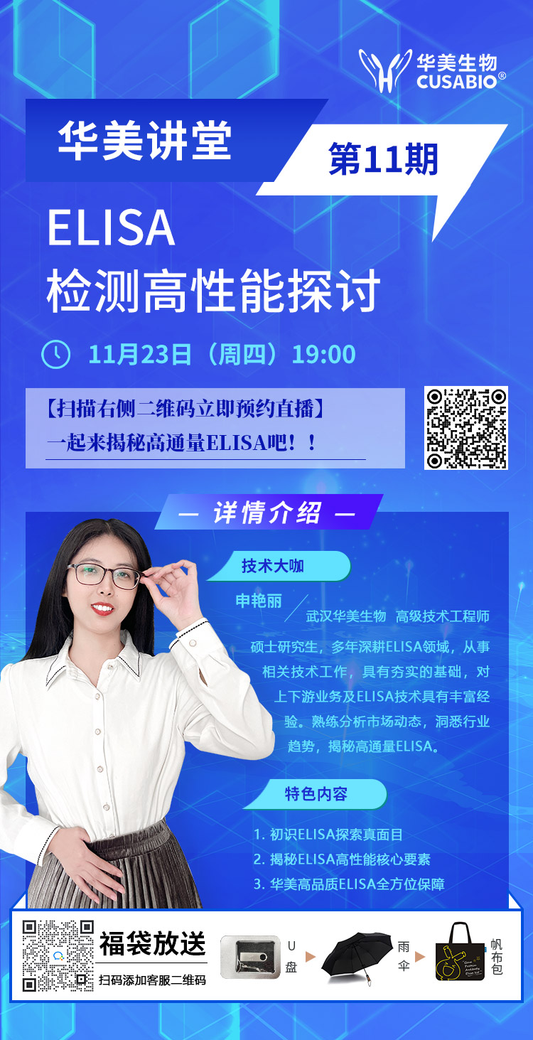 華美講堂第十一期直播來襲!主題:ELISA檢測高性能探討時(shí)間:2023年11月23日(周四)19:00直播間:武漢華美生物視頻號 特色內(nèi)容1、初識ELI