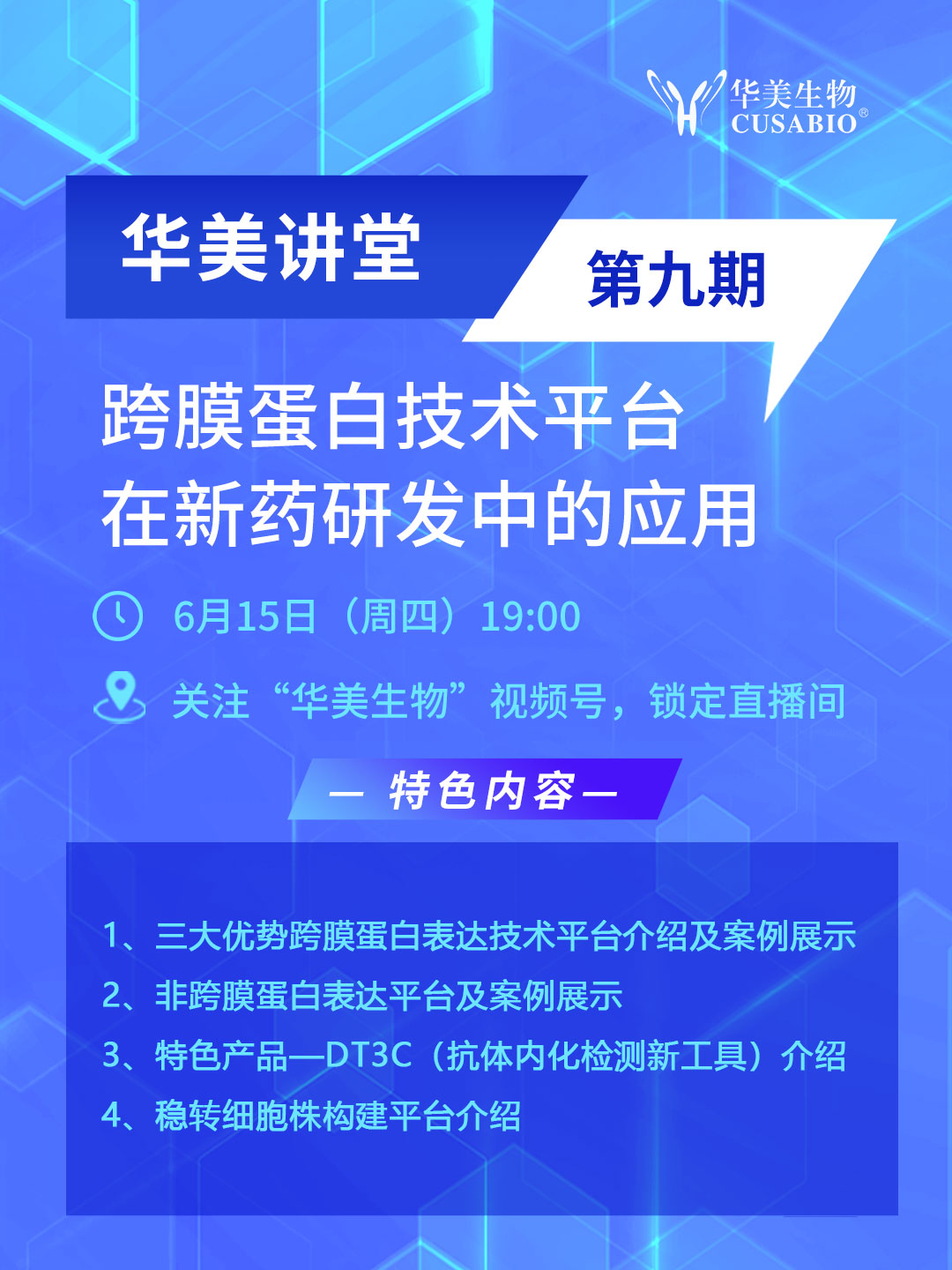 直播主題:跨膜蛋白技術(shù)平臺在新藥研發(fā)中的應(yīng)用,【直播時間:2023年6月15日(周四)19:00】,直播間:“武漢華美生物”視頻號