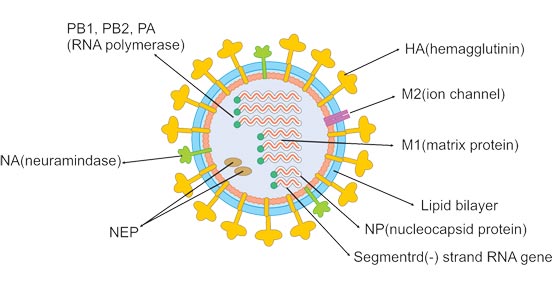 在電子顯微鏡下,甲型和乙型流感病毒幾乎無法區(qū)分。它們通常呈球形,直徑約為100nm,但有時呈絲狀,長度通常超過300nm。流感病毒顆粒的最外層是來自宿主細(xì)胞的包膜。包膜上嵌有血凝素(HA)和神經(jīng)氨酸酶(NA)的糖蛋白突起,從包膜上突出。HA和NA都決定了流感病毒的亞型。HA和NA的比例約為4:1。較少的基質(zhì)離子通道M2貫穿脂質(zhì)包膜?;|(zhì)蛋白M1位于包膜下方,并包裹住病毒核心。