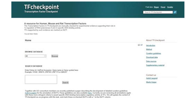 TFcheckpoint(http://www.tfcheckpoint.org/)是人類、小鼠和大鼠轉(zhuǎn)錄因子數(shù)據(jù)庫 。手動檢索TFcheckpoint中的轉(zhuǎn)錄因子可以獲得其在RNA聚合酶II調(diào)節(jié)和特異性DNA結(jié)合活性 實(shí)驗(yàn)中的數(shù)據(jù)。